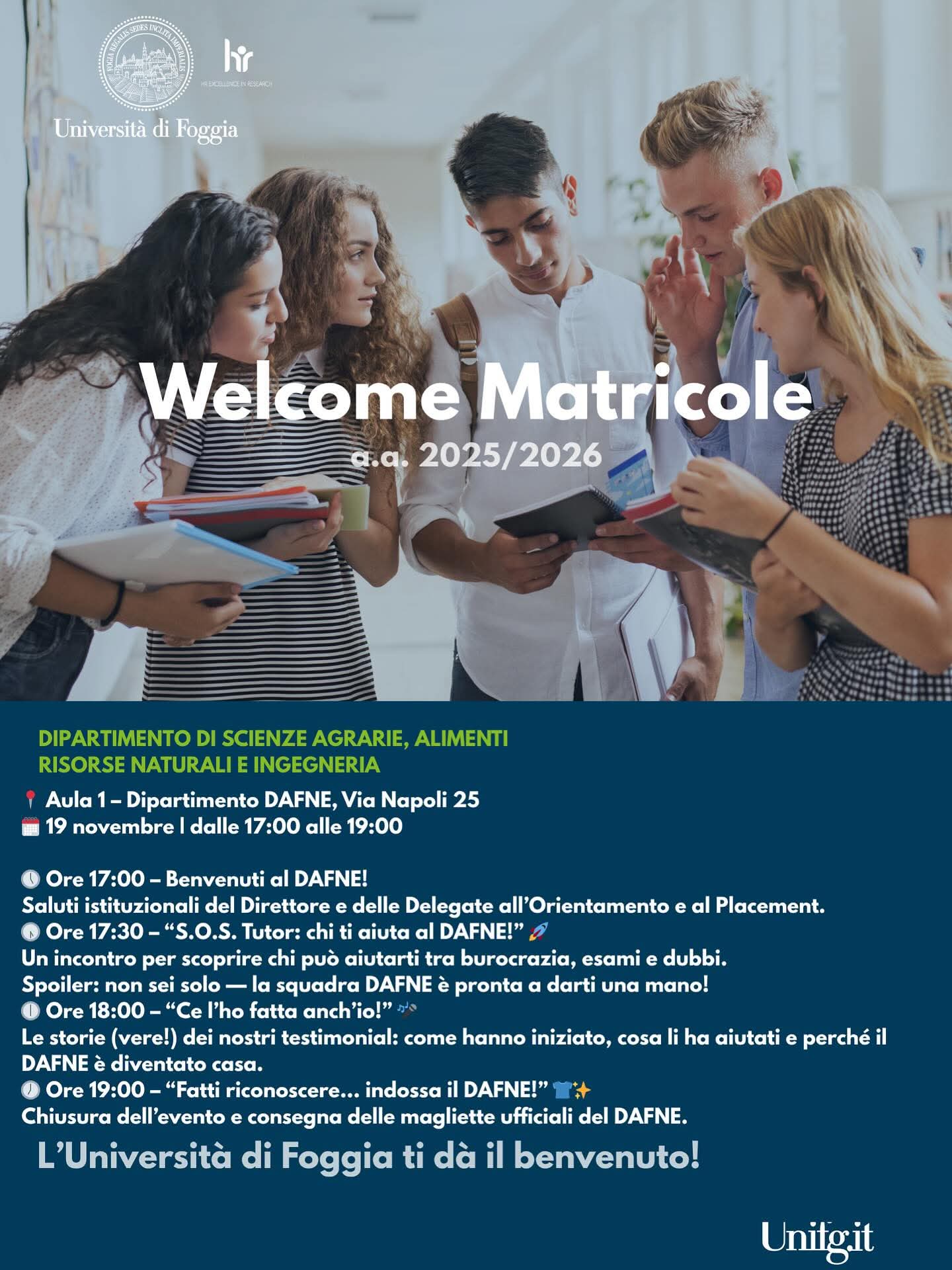 Mercoledi 19 novembre 2025 dalle ore 17:00 presso l'Aula 1 del Dipartimento Dafne si terrà il Welcome Matricole a.a. 2025/2026.